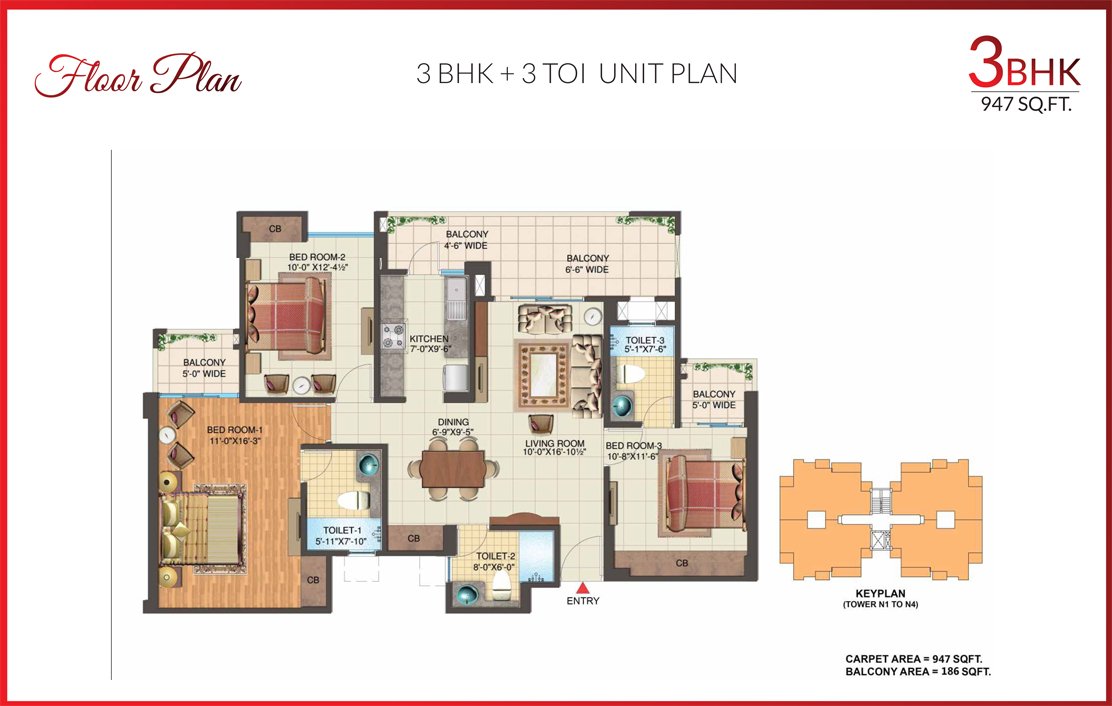 | Low Rise | 3 BHK + 3TOI (Type 1) | 947 Sq.ft | |