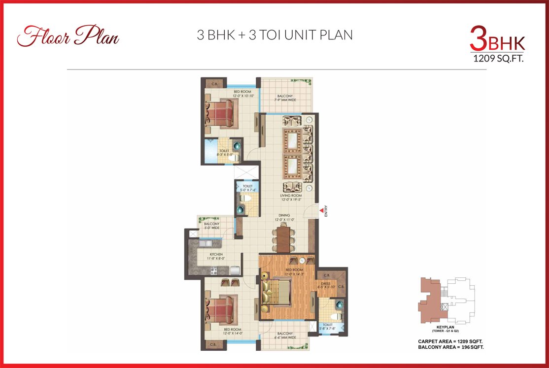 | Low Rise | 3 BHK + 3TOI (Type 2) | 1209 Sq.ft | |