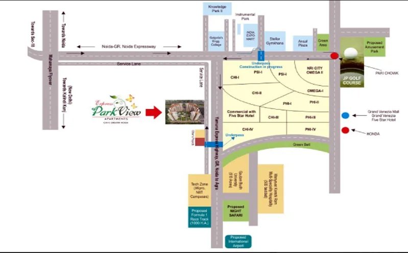 Express Park View II is located at Plot GH-03, CHI-V, Expressway, Greater Noida. The lease hold area allotted to the project is around 52493.16 Sq.m. The project is in close proximity to finest malls, hospitals, golf course and institutes.